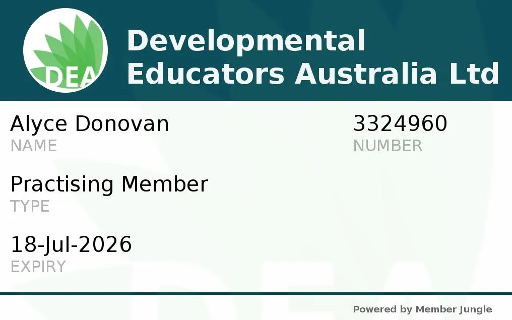 As a registered member of the Developmental Educators Australia (DEA), I uphold the profession’s values of inclusion, empowerment, and evidence-based practice.